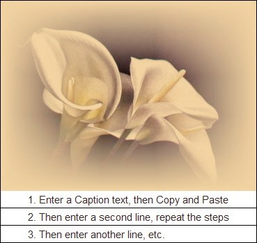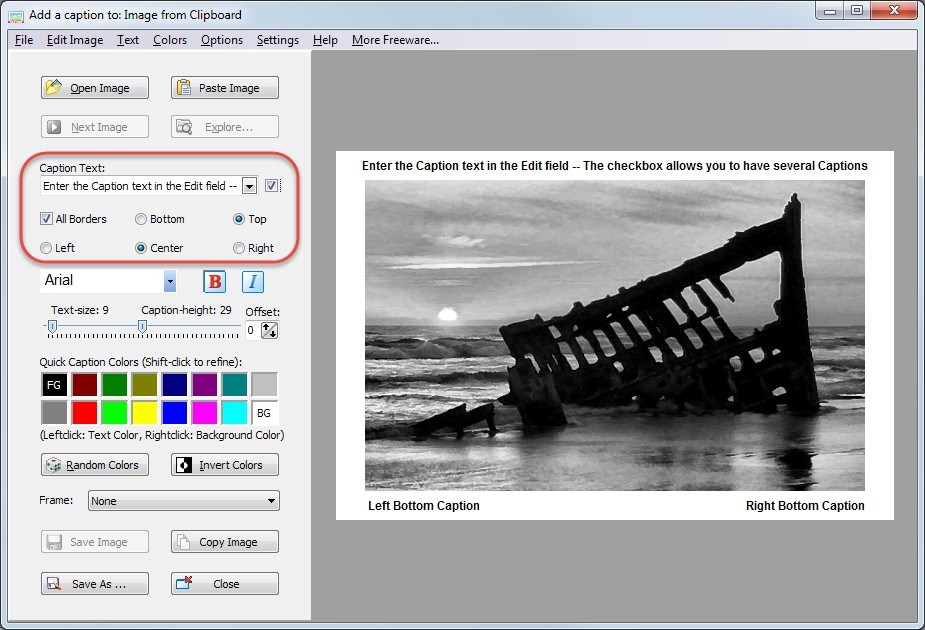 Enter the Caption text in the Edit field. Fix the current Caption with the checkbox on its current position before entering an additional Caption on an other position (Bottom, Top, Center, Left, Right).