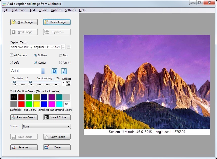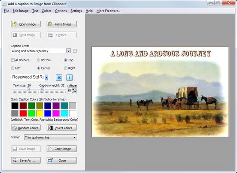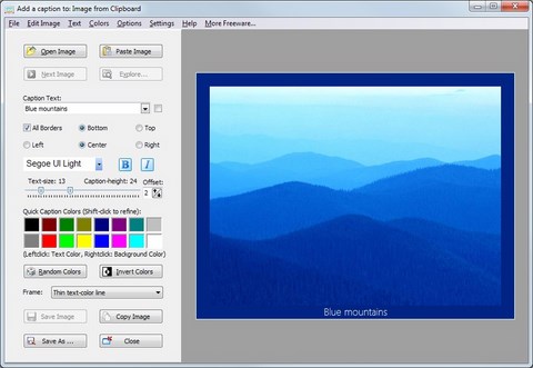 With Add A Caption you can quickly and easily add a highly configurable caption to a picture. This useful tool has features lacking even from advanced and expensive graphics programs. Add a beautiful nice-looking and informative caption to any picture in a second - e.g for your blog etc. Don't mess around with cumbersome and complicated monster graphics programs - do it the easy and simple way!