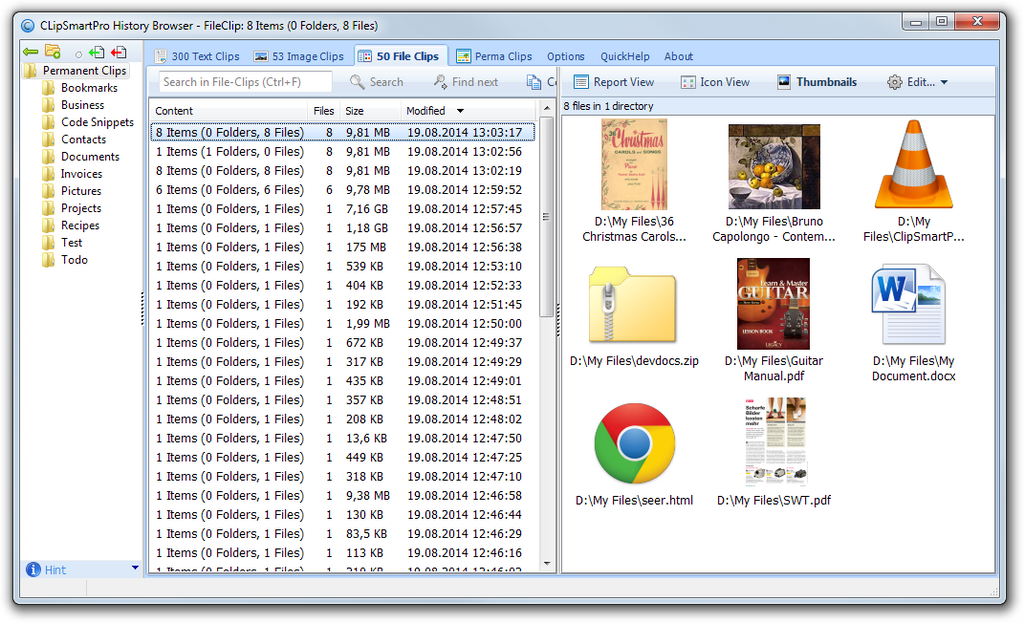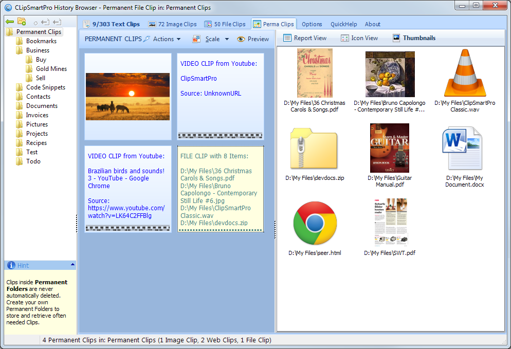 Copy files and folders in Windows Explorer to automatically create File Clips in ClipSmartPro. ClipSmartPro has a built-in Windows Explorer which allows you to handle files inside File Clips in the same way as in the original Windows Explorer!