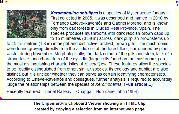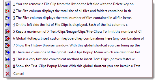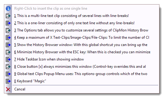 A list of every text, web page fragment, URL, video clip, image and file which has ever been copied to the Windows clipboard. This list can be restricted to a custom number of clips, sorted, searched, filtered, grouped etc.