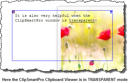 ClipSmartPro always shows the current content of the Windows clipboard in a separate window. This can be resized, always stay on top of other windows, can be made semi-transparent and can send the clip to a mail recipient or to a file.